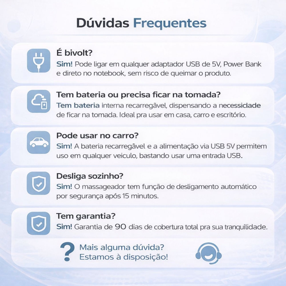 Resposta: Na verdade, não é necessário se preocupar com voltagem, porque este massageador funciona com bateria interna recarregável via cabo USB. Isso significa que você pode carregá-lo com qualquer adaptador de celular, power bank, ou até direto no notebook, sem risco de queimar o produto.