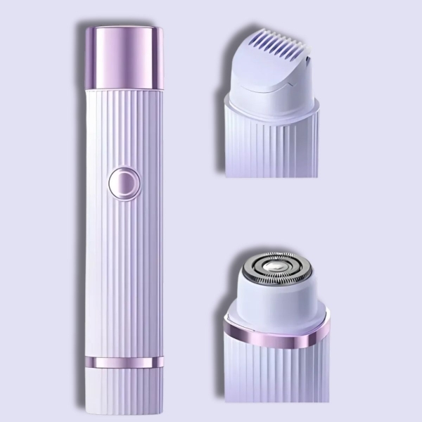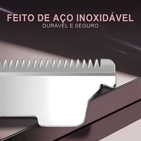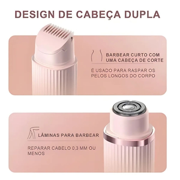 Cabeças removíveis multifuncionais: acompanha pelo menos duas cabeças, sendo uma para raspagem e outra para afinamento ou acabamento, o que permite ajustar a depilação conforme a necessidade.